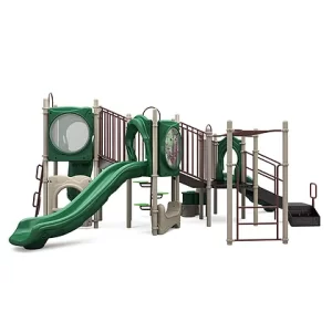 The Augusta play set is for children who love to zip down slides. The Augusta features three fun slides that shoot out of the structure on either side. Children will have a blast on either the 3ft or 4ft single slide or racing each other to the bottom on the double slide. They can climb back to the top via one of the structure’s dynamic Trunk Climbers or Rock Climbers. The little ones can enjoy catching a beat with the Bongo Drums or enjoy the sound of rain with the rain wheel. While also dreaming about places to visit on the World Map Panel. The Gear Panel and the Four in a Row Panel are close by to keep the adventures going. The Augusta is an ADA-compliant commercial grade system, available for Quick Ship in the Primary or Nature palette, with the option to add components and change it to a custom design.