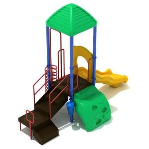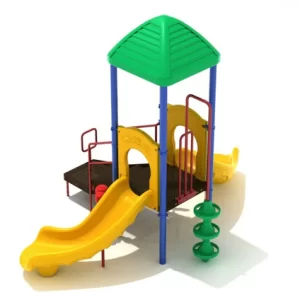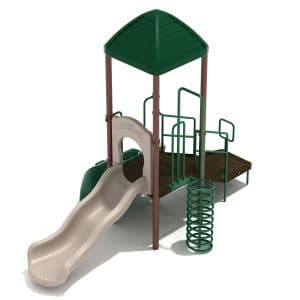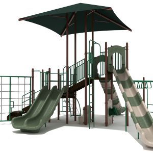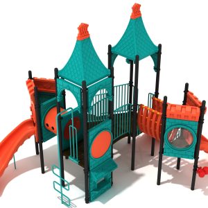 The Century Oaks Playset is a wonderful addition to any play area which offers children a ton of different ways to have fun. There is a Tilted Wavy PE Rock Climbing Wall, which provides a somewhat challenging climbing activity, promoting good exercise. There is also a Sea Creature Climber for an easier way up, which is covered in fun imprints of nautical shapes and sea creatures. There are two slides of varying sizes as well. The 4-foot Right Turn Slide is a great activity which every child can enjoy. However, for those who prefer something a little bigger and faster, the 6-foot Straight Slide is guaranteed to excite. There is a Ship’s Wheel and Single Drum mounted on the ground level for extra fun. There is even a Bubble Window Panel placed at the highest deck to offer children a 180-degree vantage point of the playground from above.