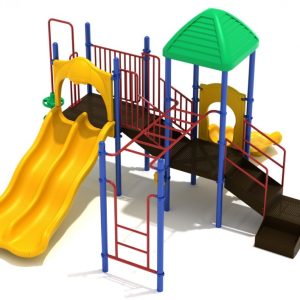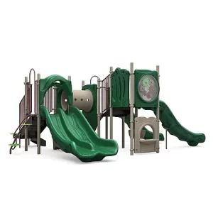 Description PLAYSET SHIPS IN 2-3 WEEKS (avg.) Age Range: 2-12 years Child Capacity: 18-21 Fall Height: 4' Safety Zone: 27' x 27' 4" Take refuge in a dazzling open-air oasis with the Village Green play structure. This sprawling set features three elevated platforms of varying...