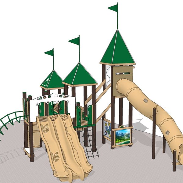 Let your kids take a trip to the Alps with this playground playset! Features include outdoor laminated photos of the majestic Alps mountain range, 9′ high Reversing Spiral Slide; Rock Climbers, Rope Net Climbers; 6′ Alpine Thunder slide; Spiral Loop Climber, 3 Castle Roofs with flags; Deep Rung Arch Climber; Clatter bridge.