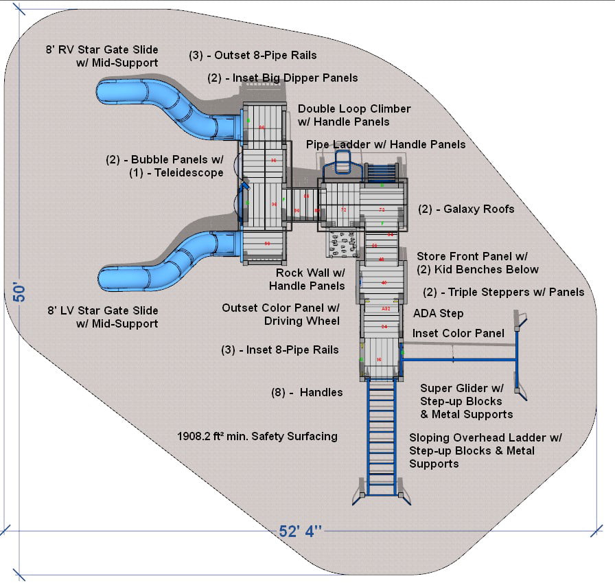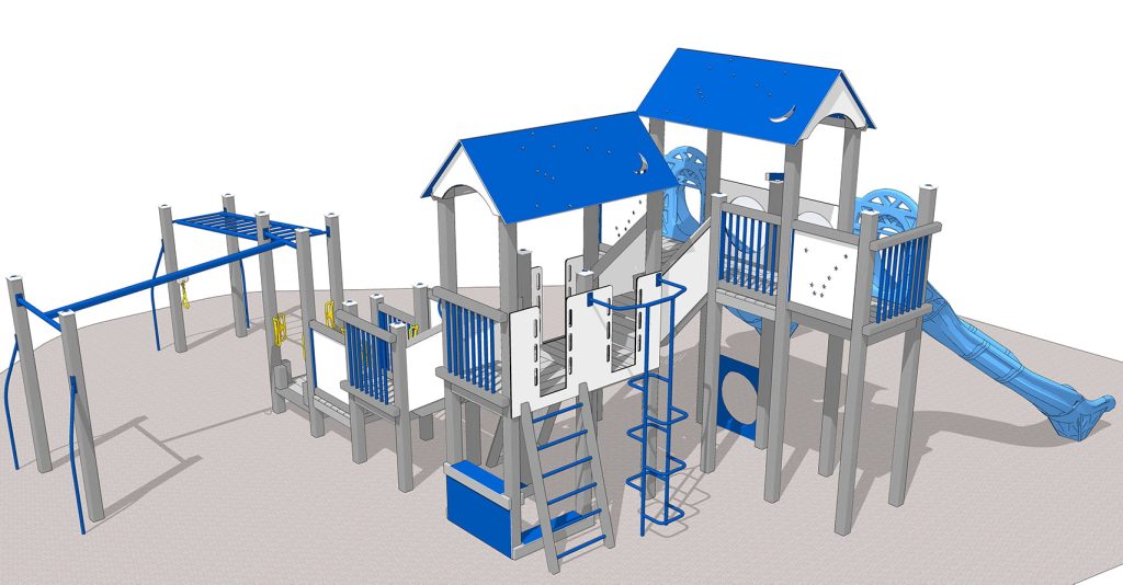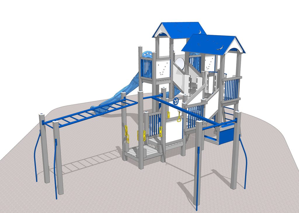 The galactic playground theme continues with Galaxy roofs and Big Dipper panels. The twin Star Gate slides will transport children back to Earth.