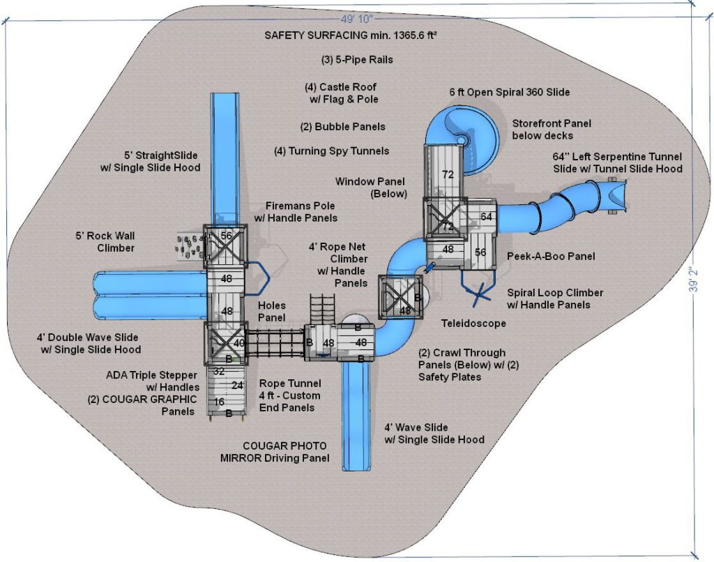 This generously sized Cougar themed playset will challenge and entertain dozens of elementary-age kids. Perfect for a school, especially if your mascot is a cougar!