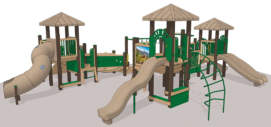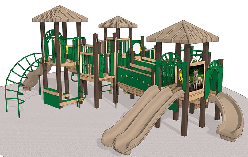 This generously sized Coyote themed playground playset can accommodate dozens of elementary-age kids. Perfect for a school playground!