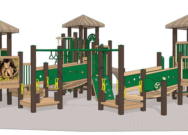 This generously sized Coyote themed playground playset can accommodate dozens of elementary-age kids. Perfect for a school playground!