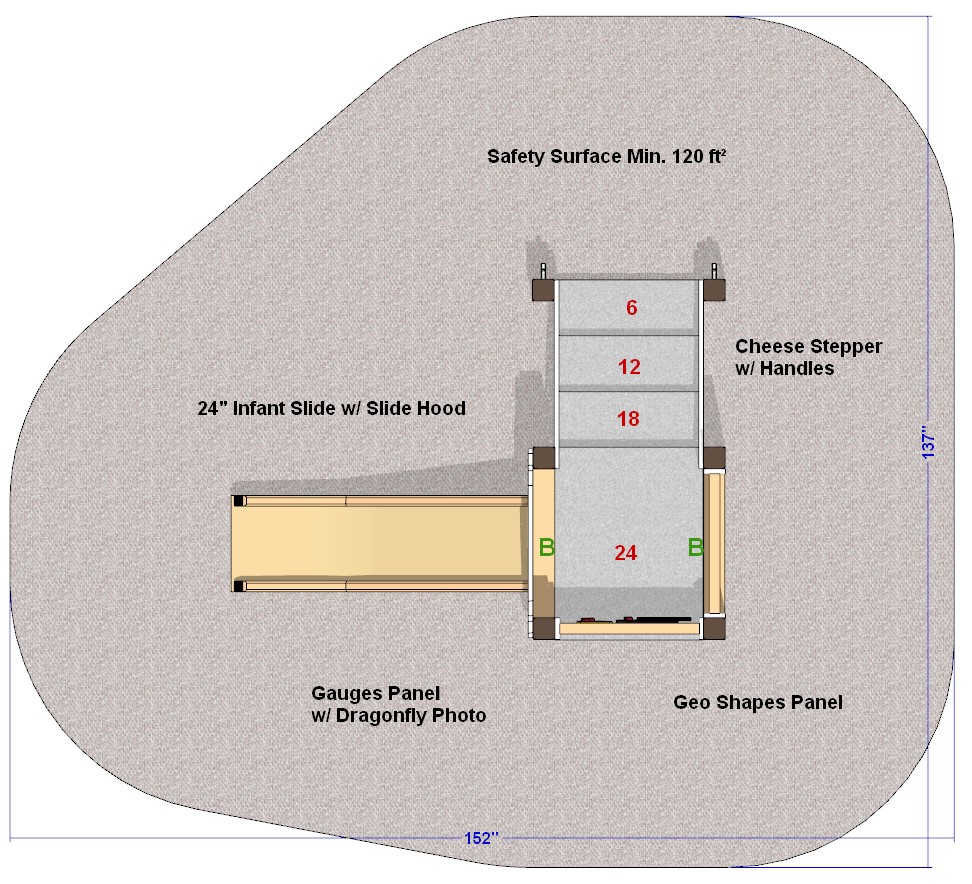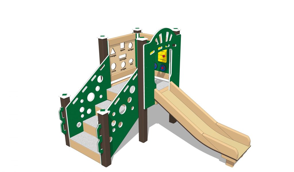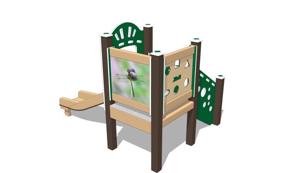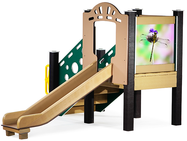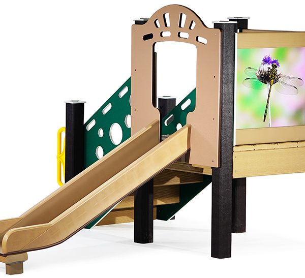 The Dragonfly infant outdoor playset is sized perfectly for children aged 6 months to 23 months. The Cheesy Stepper, reminiscent of Swiss cheese, provides easy access to the deck. At the top, cutouts in the side panel introduce geometric shapes and supply plenty of viewports.