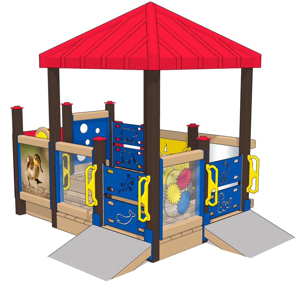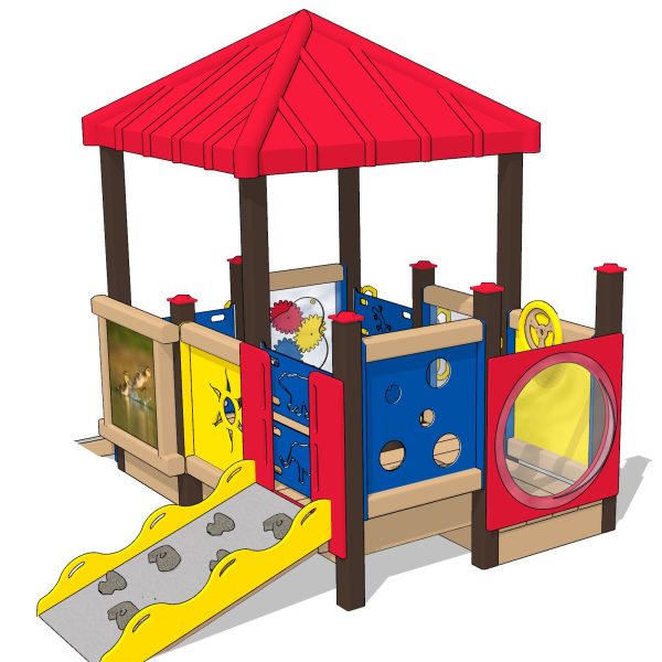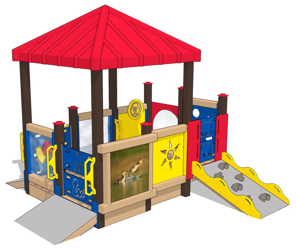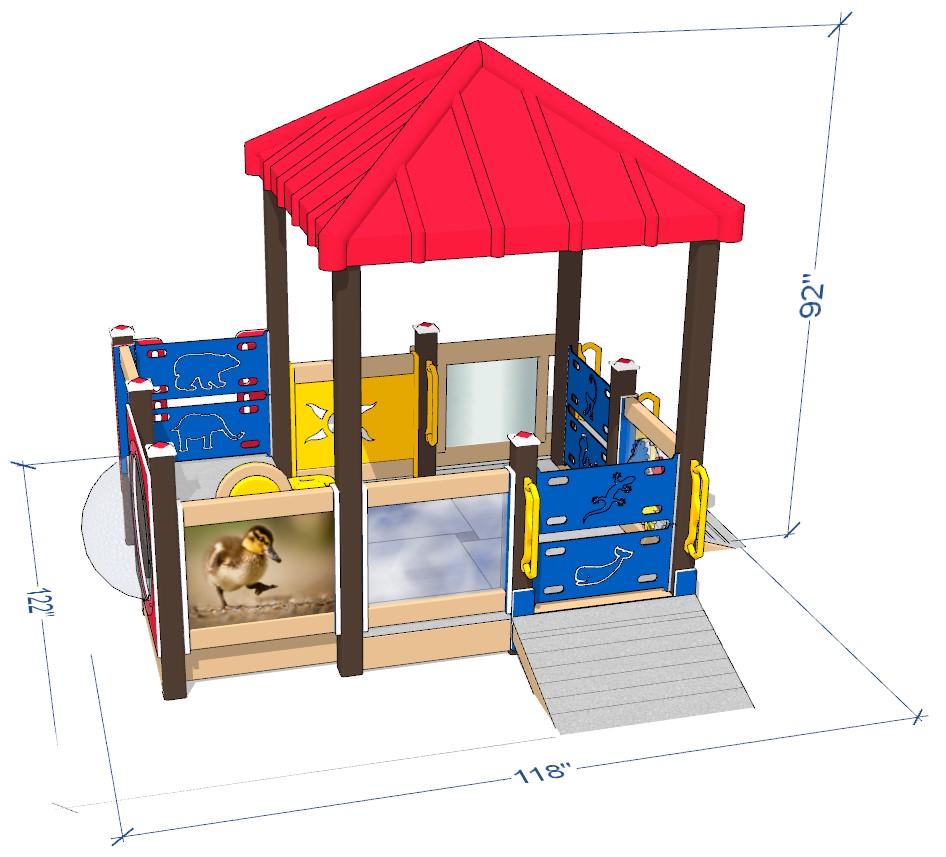 Fun on the playground is just “ducky” with our Ducky Infant playset. This set has covered space on a raised deck that keeps youngsters shaded and contained. Tots can motor up and down three different ramps, which are covered with a rubberized surface for a secure climbing experience. Once on the deck, they have access to multiple activity panels: ducky photo/mirror, oval gears, pull-up handles, peek-a-boo holes, steering wheel, window/mirror, and solar shape cut-outs.