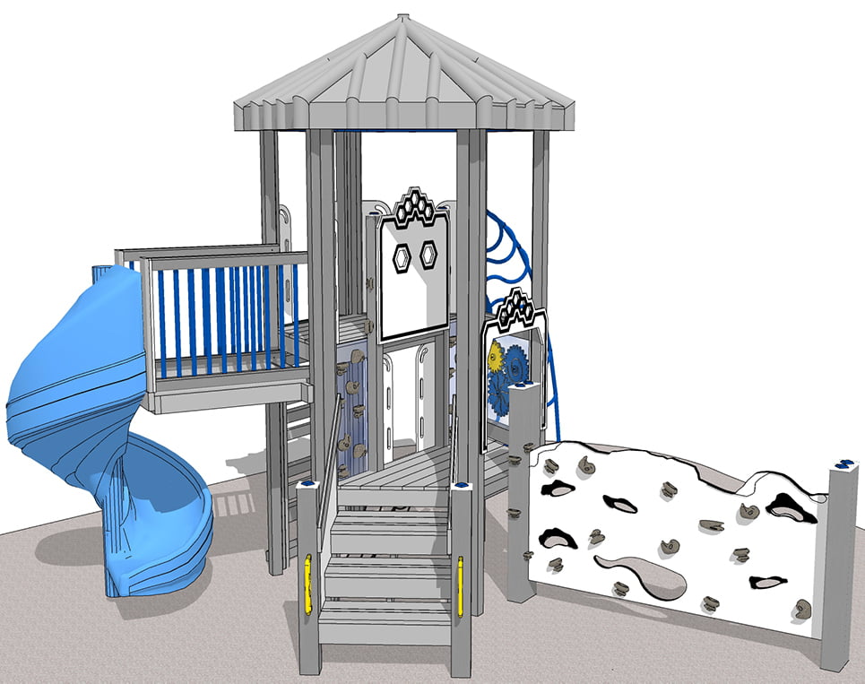 Multiple climbers encourage kids to develop their balance, strength, and agility. Our interactive gear panel introduces basic engineering to make Gustave Eiffel proud. The open spiral slide adds pure fun!
