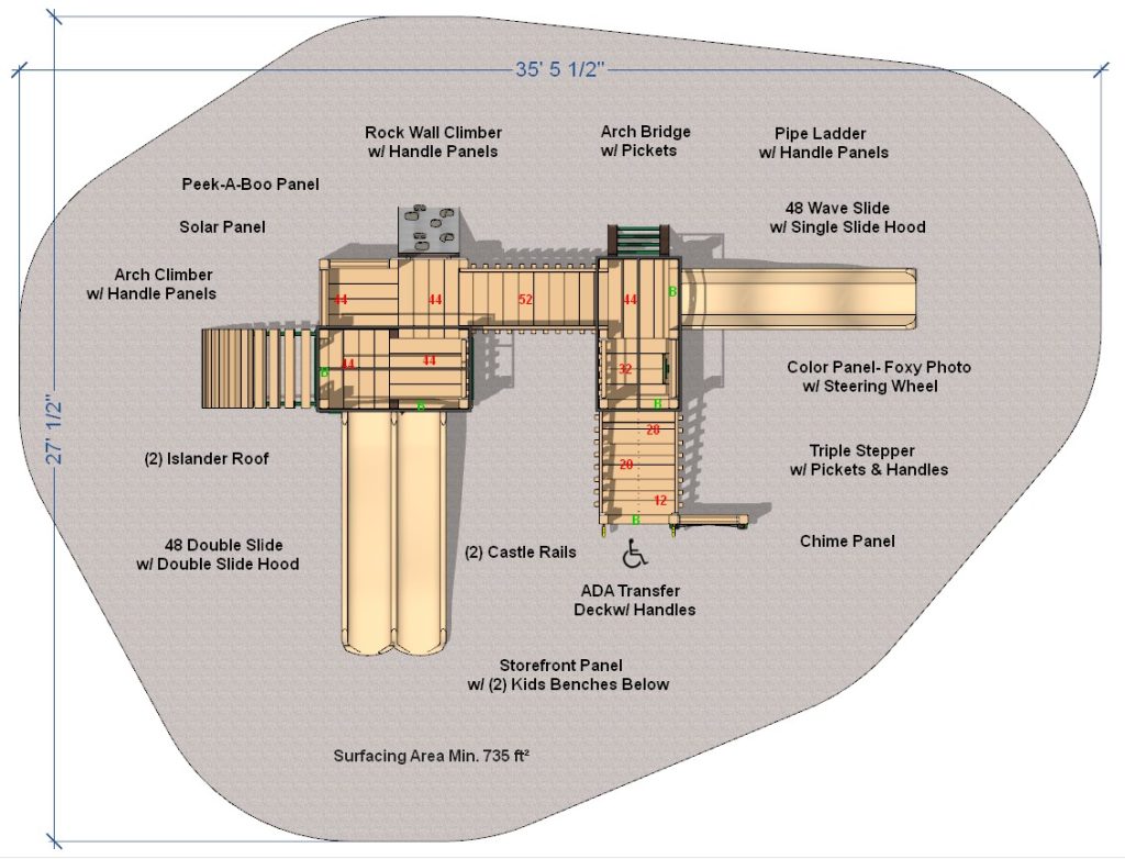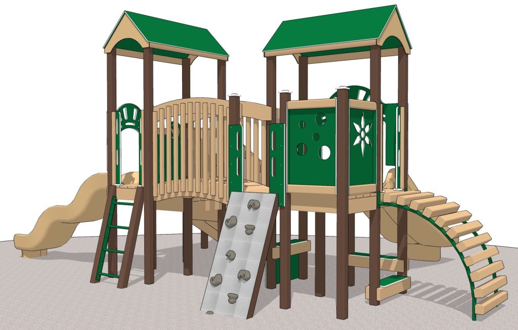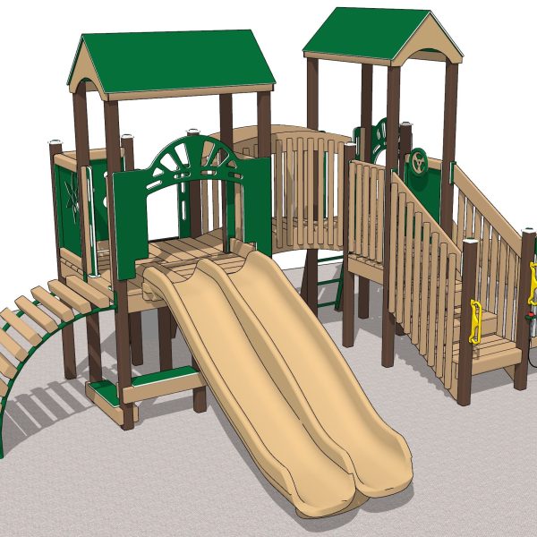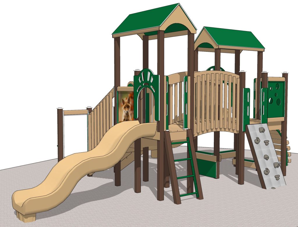 The Foxy Playset is designed with preschool children in mind. The playground playset is modestly sized, but packed with features! This charming playset fits into a 27′ x 35′ footprint in your play area.