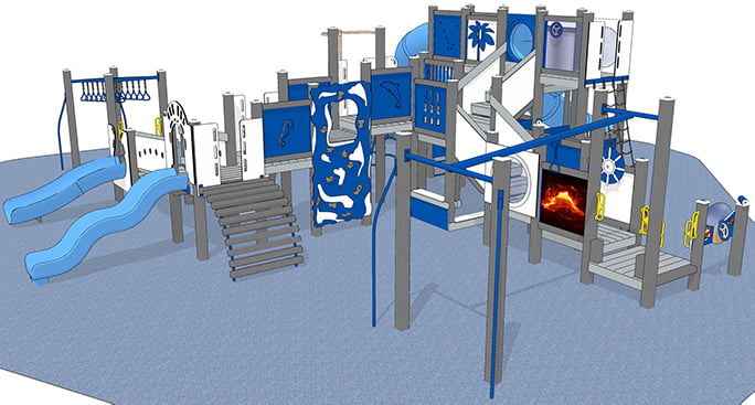 The huge Kilauea Mega Playground play system keeps kids as active as the volcano for which it is named. Children can spend hours climbing, playing, imagining, and more on this playground. They’ll build muscles as they race over imaginary lava pools on the Dual Ring Ladder.
