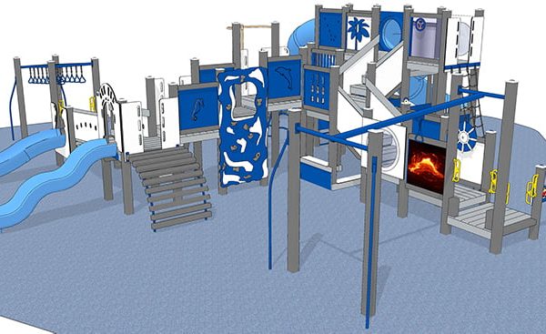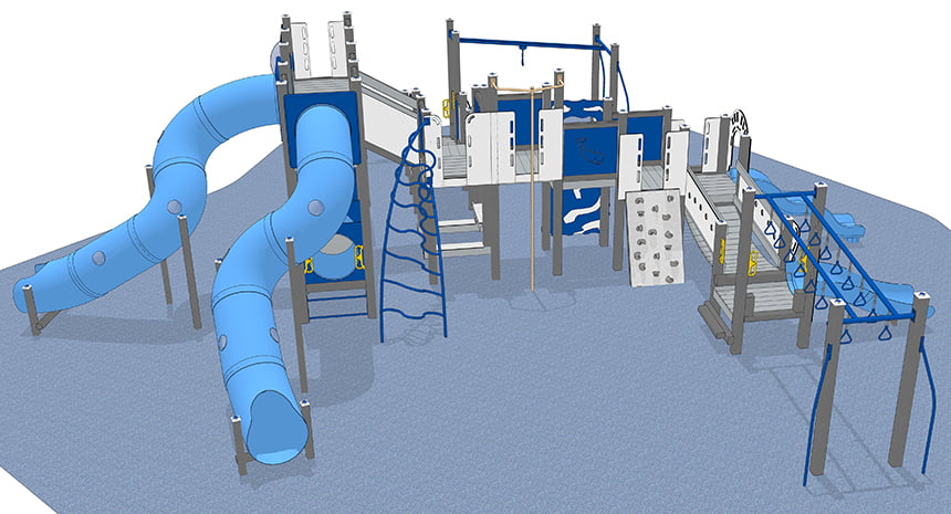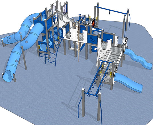 The huge Kilauea Mega Playground play system keeps kids as active as the volcano for which it is named. Children can spend hours climbing, playing, imagining, and more on this playground. They’ll build muscles as they race over imaginary lava pools on the Dual Ring Ladder.