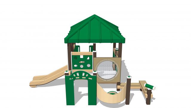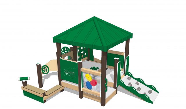 Our proprietary single slide has a surface with just enough texture to ensure confident sliding. Back at ground level, colorful gears in the interactive panel promote interest in mechanics and the sciences.