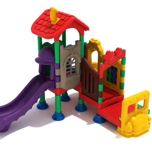 The Moonlight Imagination Station is designed to captivate and engage children at every level. Whether playing on the ground or exploring the elevated deck, kids will find endless opportunities for fun. On the ground level, they can enjoy sensory play with the Rain Wheel and Bongos. Climbing up via the Fish Stairs or Transfer Station, they’ll discover a Car Panel, sparking imaginative play as they take the driver’s seat, and a Tic Tac Toe Panel, where they can challenge friends in a friendly competition. When they’re ready for more excitement, the Hard Hat Straight Slide offers a safe and thrilling ride back to the ground.