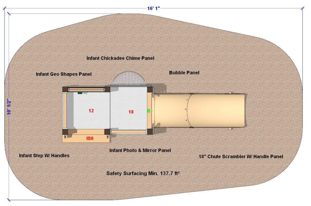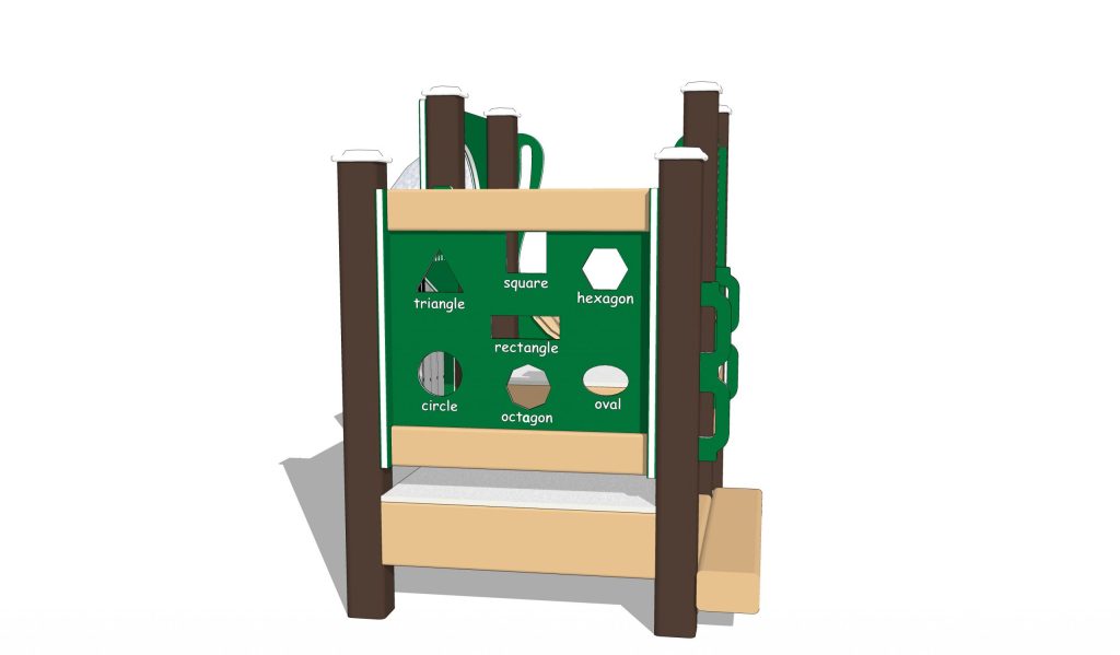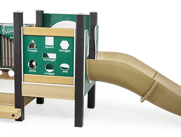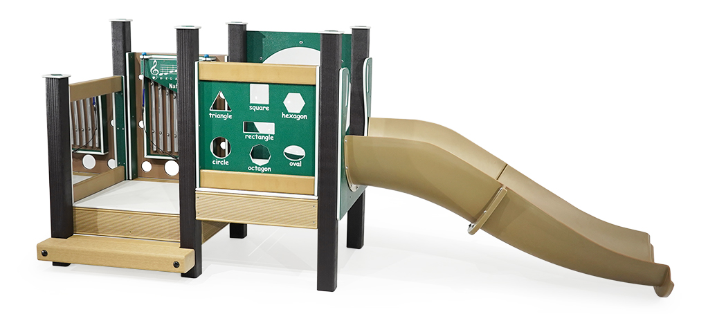 The decks are covered with a rubberized surface for a secure climbing experience. Children make music with the built-in Infant Chickadee Chimes Panel, then make funny faces in the Mirror Panel. On the next level, they will learn shapes and look through the bubble panel before sliding down the Chute Scrambler.