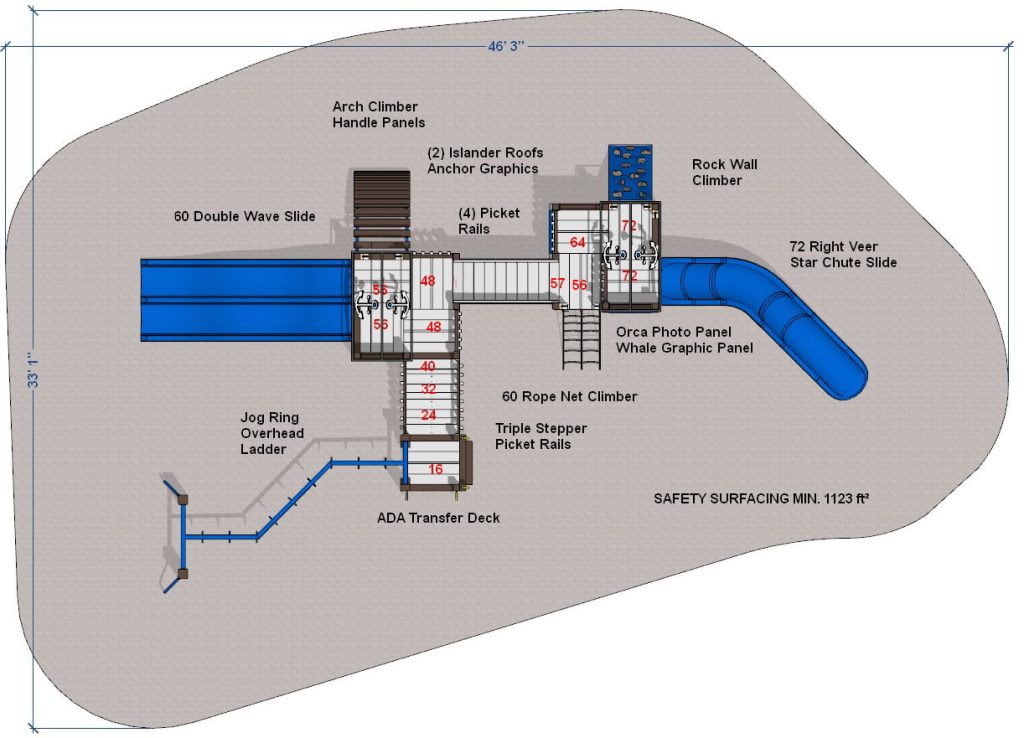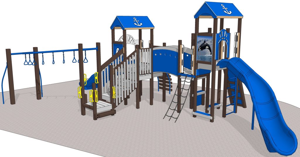 The Play Mart Orca mini playset is perfect for your community, school, or church playground. An athletic Orca leaps from the sea in his vivid photo panel on this play system. Our winter color scheme mimics the brilliant hues. But you are free to order this play set in the color palette of your choice. Engraved dolphins and anchors continue the nautical theme.