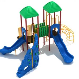 Description The Falcon Ridge play structure features 6 different slides including a 7ft triple slide, a double slide, and a single slide. You can enter the structure either by the Rock Climbers, Trunk Climbers or the stairs. Children and their friends can race down the...