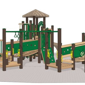 Age Range: 2-5 years Child Capacity: 15-20 Safety Zone: 30′ x 21′ This addition to our playground product lineup has a bit of everything! There is the heavy-duty rope climber, made of industrial-grade rope; a vertical rock wall climber, built on a thick clear poly...