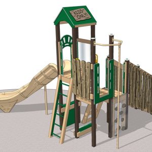 Description Age Range: 5-12 years Child Capacity: 22-33 Safety Zone: 29′ x 26′ Welcome to the Play Mart Wonky Treehouse Playset. How can you have a treehouse without a suitable tree? By installing our Wonky Treehouse! Multiple climbers provide entry at different heights, just like...