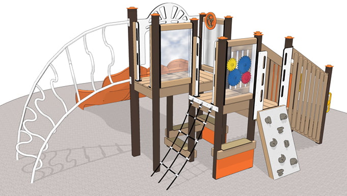 On the Panther themed playset you’ll find a Gears panel, Chime panel that is ADA compliant, Rope Climber, and the Vortex Climber to challenge kids physically, mentally, logically, and more.