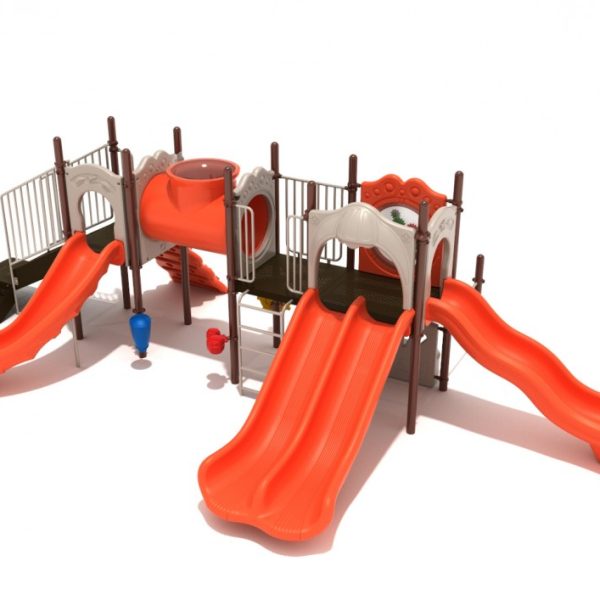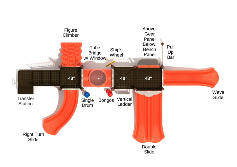 This whimsical playset is the perfect structure for kids of all ability levels who love slides, bridges, and creative on-ground fun! The Portland design features three 48” square elevated platforms, two of which are joined by a charming Tube Bridge, complete with viewing window. The Portland also boasts a Number Climber, Vertical Ladder to add extra physical challenges. Stairs also give kids access to the structure’s main platforms. Right turn, Double, and Wave Slides provide children with a fun and breezy way to the bottom of the structure, where they’ll find a Bench Panel, Ship’s Wheel, Single Drum, Pull Bar, and Bongos, all of which make the structure ADA compliant. A gear panel on the upper level facilitates engagement and imaginative play, and the structure is large enough to accommodate a whole class of children at once, with a variety of play accessories.