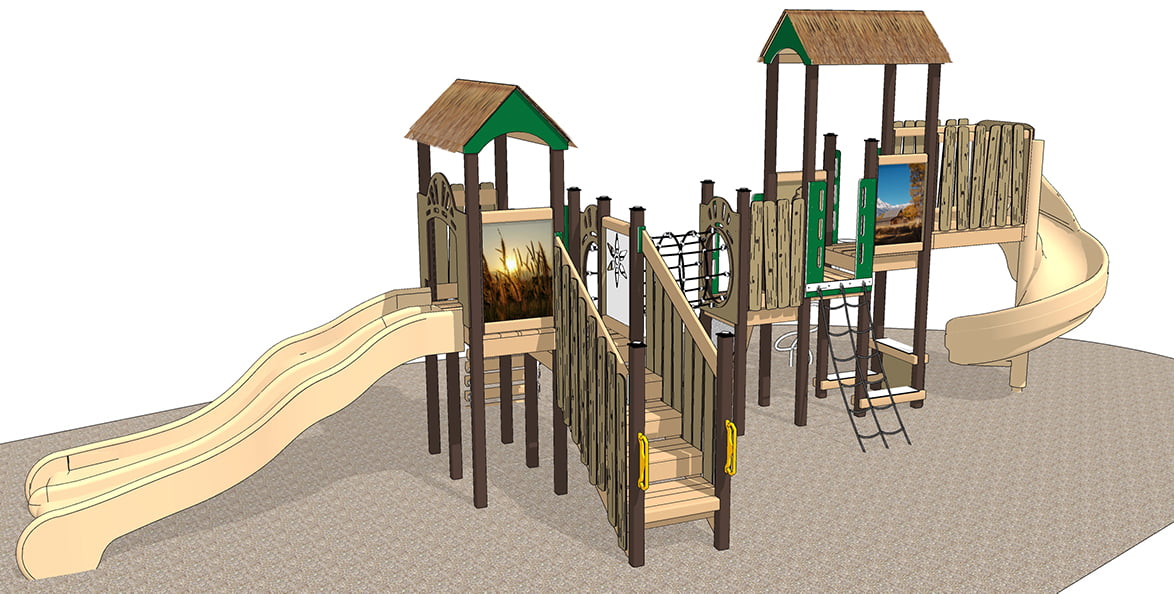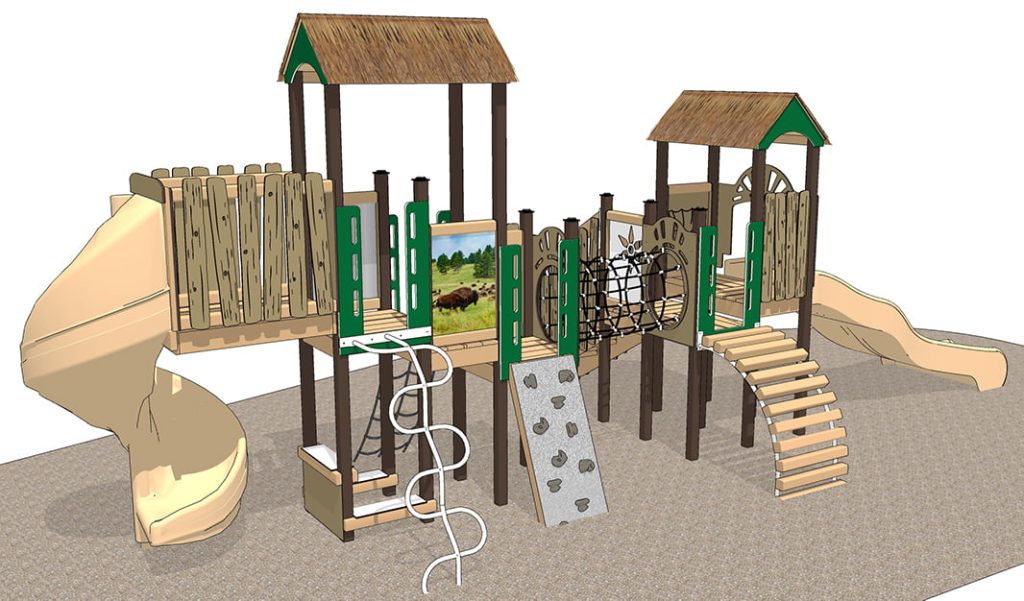 Called the Prairie, our prairie-themed play system congers up America’s Great Plains with wide-open spaces and roaming wildlife. Beautiful full-color photo panels showcase the Prairie and Buffalo that inspired this playset. Our engraved plank rails mimic the barn featured in one of the photo panels. Encouraging children to imagine they are at play on a Prairie Homestead.