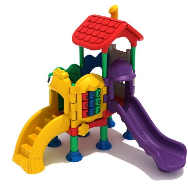 Many play structures are large, expansive, and contain a variety of amenities. They’re great for large areas that accommodate a wide range of children, but what about smaller areas? Part of the Raindrop Imagination Station’s appeal is that it can be situated on playgrounds with limited square footage and still offers the same classic play structure features that kids know and love. On the ground floor, children can spin the Rain Wheel around, perhaps envisioning themselves at the helm of a boat or a car, while more musically-inclined kids will love the percussive qualities of the Bongos. After a brief climb up the Fish Stair, kids can challenge their peers to a game using the Tic Tac Toe Panel, as well as peer out at the rest of the playground through the Window Panel and the See Through Panel. Once finished, they can cascade back down the ground using the Hard Hat Straight Slide.