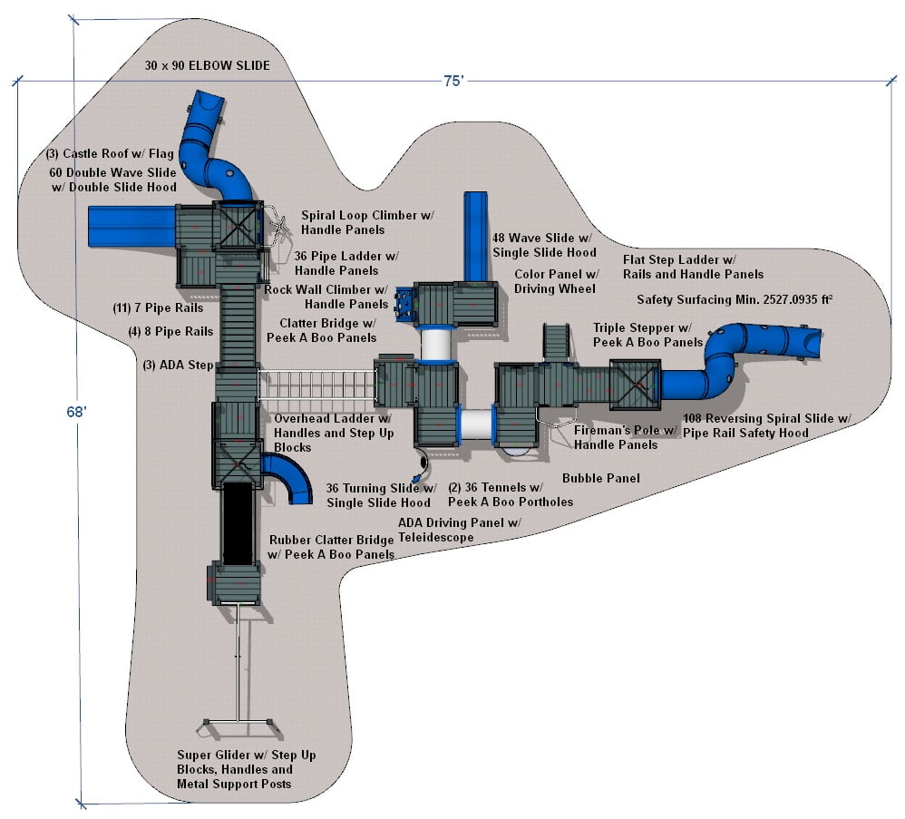 Description Age Range: 5-12 years Child Capacity: 100 plus Safety Zone: 94′ x 62′ This set is as majestic as the Eagle featured on its photo panels. From the accessible ramp to the towering tube slide, dozens of kids will have space to play on this...