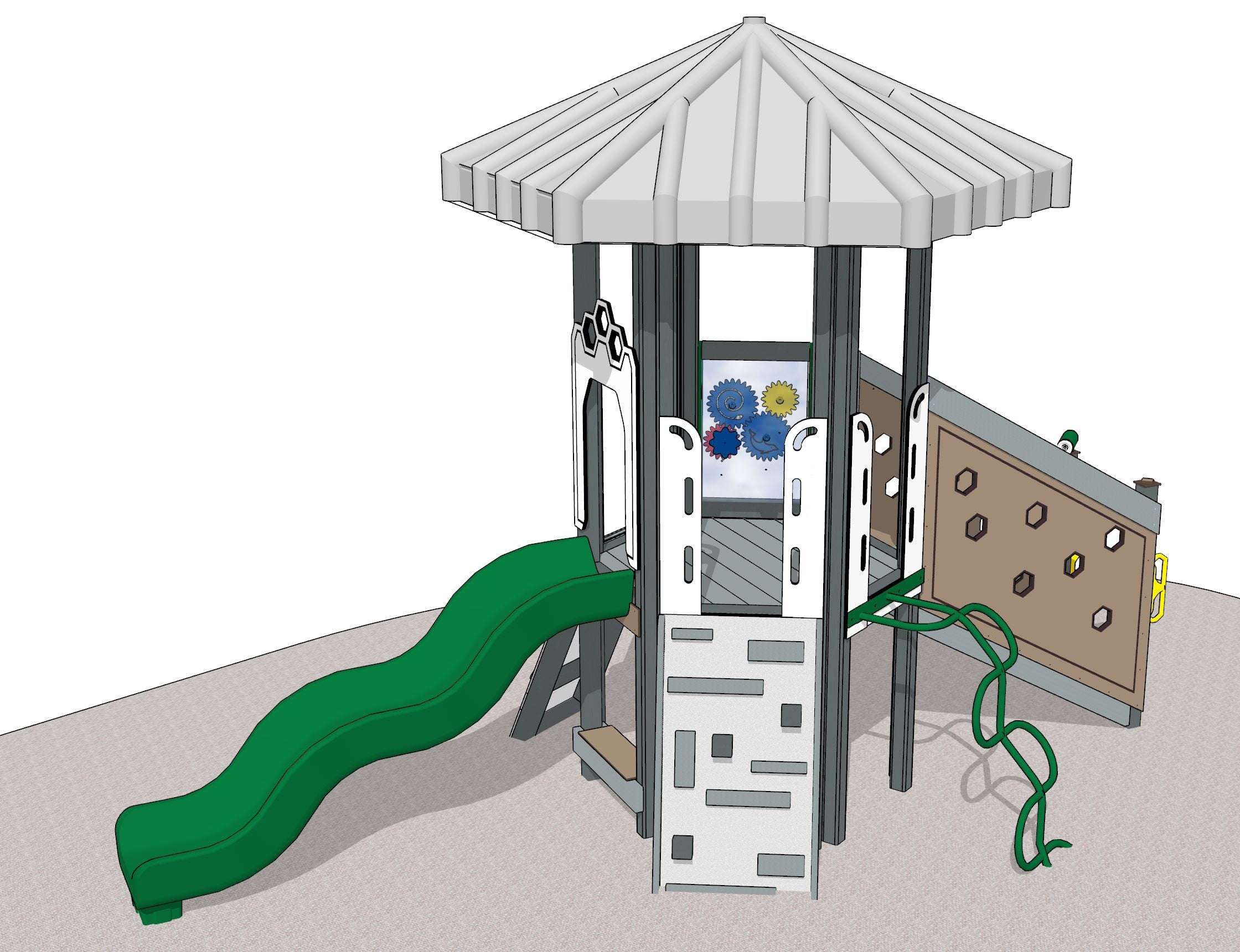 The River Otter mini playground is one of our American animal series, which features Hexagon playsets. This playset is the perfect choice for tight budgets and smaller play areas. The compact, yet vertical design boasts six exciting play features for maximum fun in limited spaces.