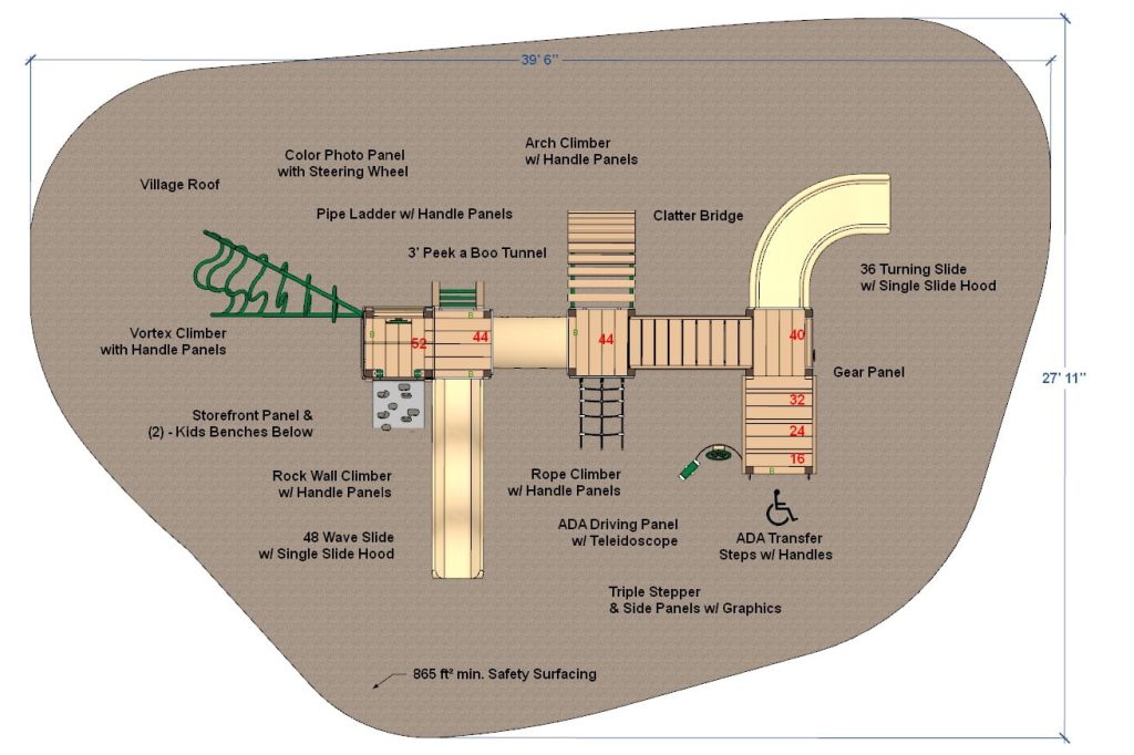 Youngsters may leave tracks of their own as they scamper up the multiple climbers. They’ll learn to move with the Rocky Raccoon’s agility as they progress from the Rock Climber to the Arch Climber, and up to the Vortex.