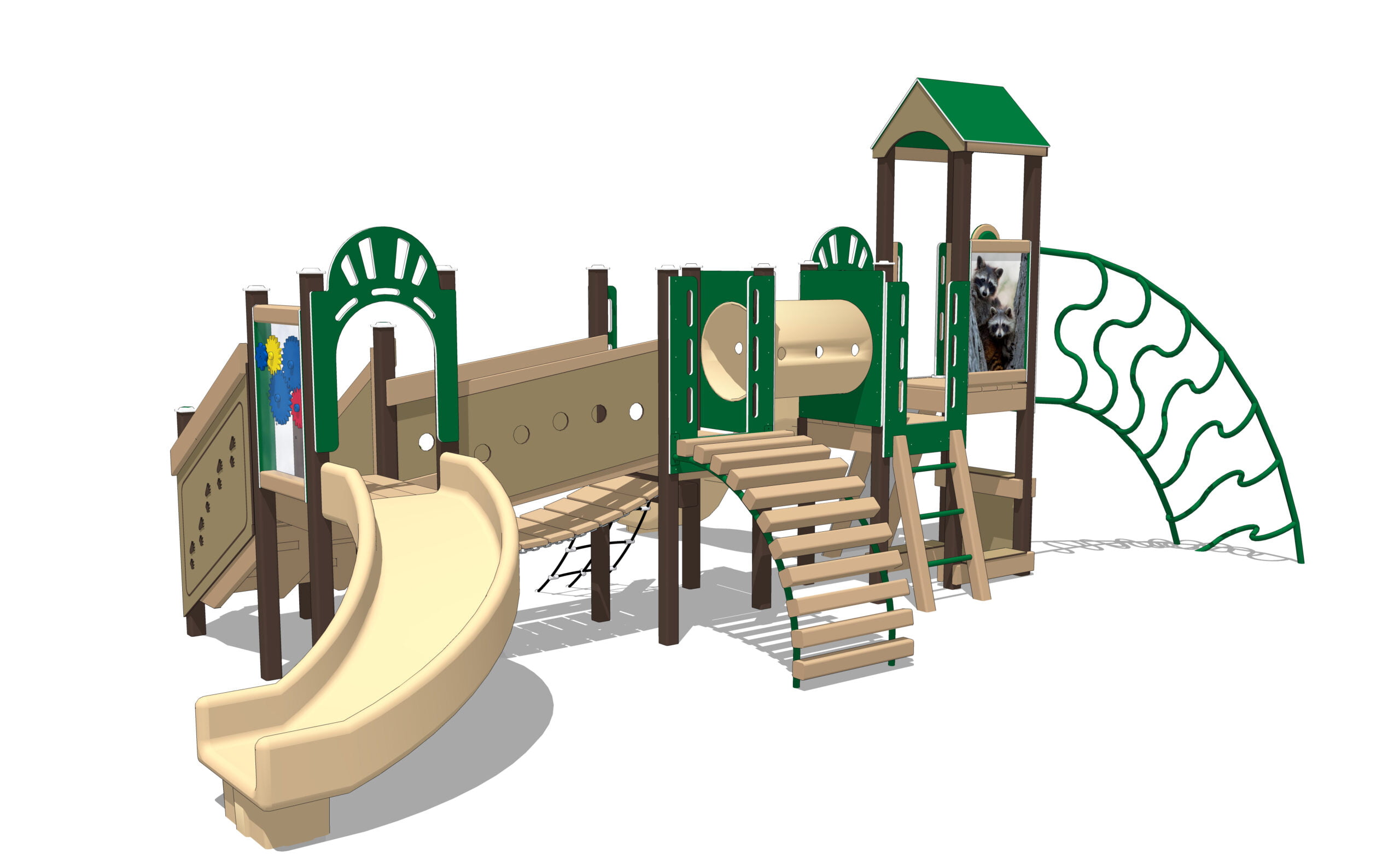 Youngsters may leave tracks of their own as they scamper up the multiple climbers. They’ll learn to move with the Rocky Raccoon’s agility as they progress from the Rock Climber to the Arch Climber, and up to the Vortex.
