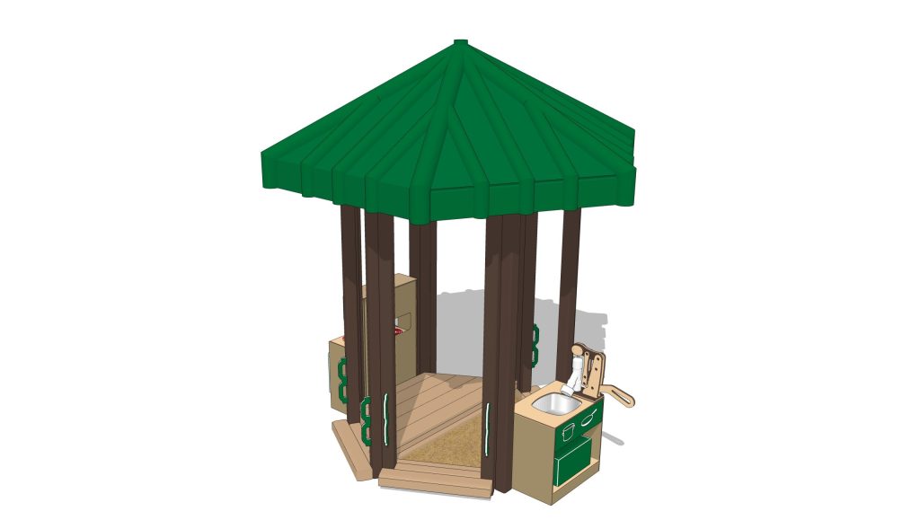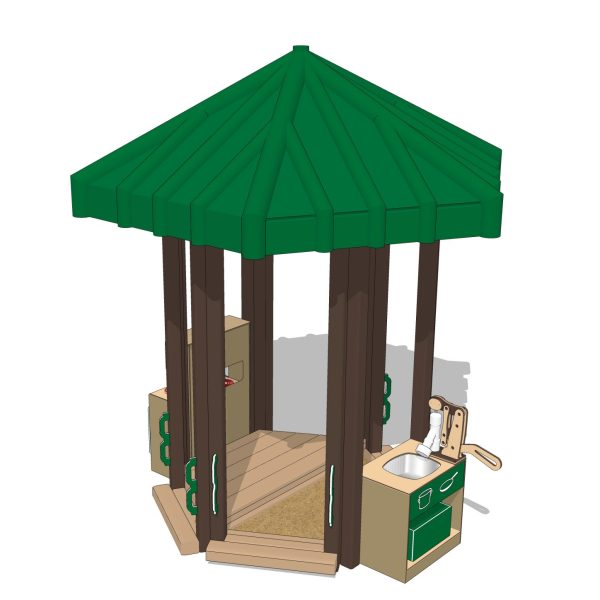 More than a sandbox, more than a covered play deck, our Sand Deck Kitchen will encourage imaginative play and cooperation. Add any of our modular pretend kitchen appliances to inspire the future chef! Play kitchen appliances—components from our Mud Kitchen series—are fastened securely to the dual Hex posts and may face either inside or outside. All Mud Kitchen components are modular, so you can mix and match them to suit your playground. (May require additional cost.)