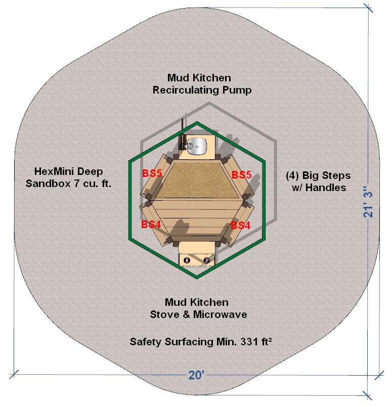 Safety Zone: 25’-6” x 19’-6” Age Range: 2-5 years Post Size: 3.5 inch Child Capacity: 12-14 Fall Height: 36” 4’ Border Estimate: 19 Meets ADA Guidelines Elevated: 3 Ground Level: 1