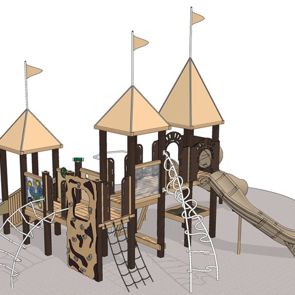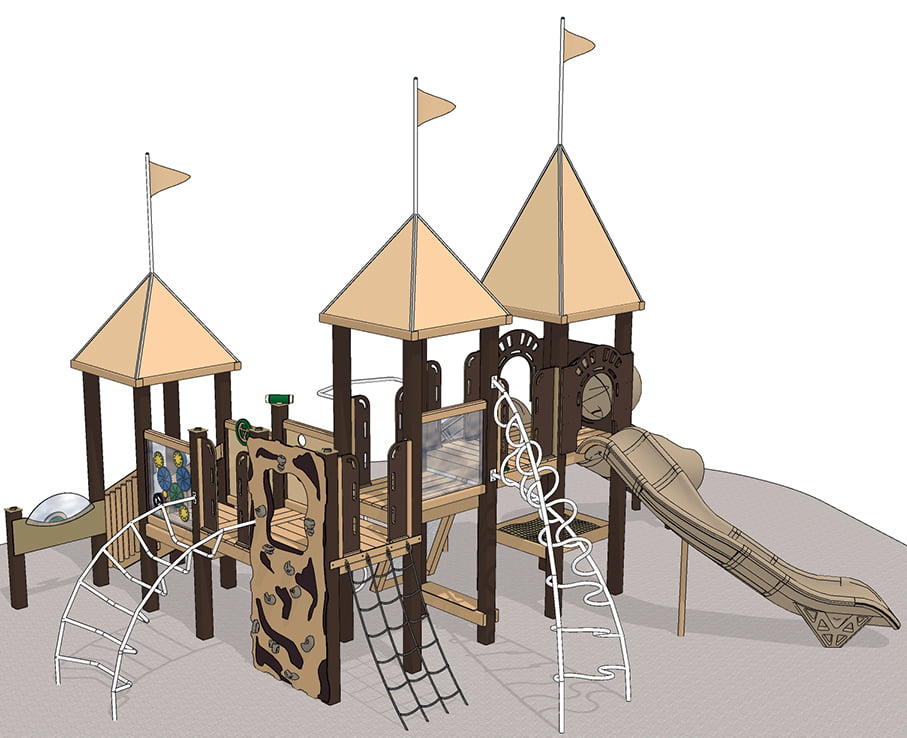 Summit aptly describes this play system for an exciting children’s playground. Kids can climb up the Summit and choose from three slides that lead from a deck a full 6 feet high! To reach that lofty height, skilled young mountaineers can ascend by way of the twisty Vortex climber. Or, they can choose the Rope Net and Deep Rung Arch climbers options for the less daring. A vivid full-color Photo Panel of a rock climber illustrates the exuberance of a successful climb.