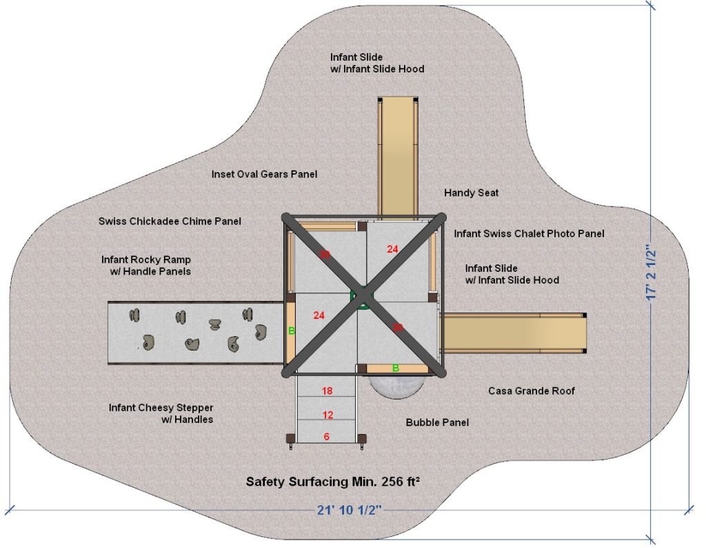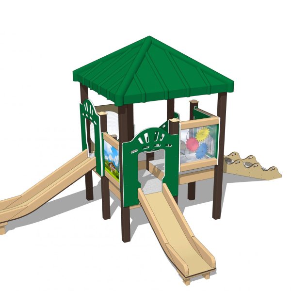 Playground equipment is designed for Infants 6 months to 23 months! The Nature of Early Play Swiss Chalet playset was created just for infants. This playground playset features our new Infant Rocky Ramp with Handle Guards, new Infant  Slide, new Cheesy Stairway, new Infant Chickadee Chime panel, and our Casa Grande Roof. Perfect for little ones to climb, explore and play.