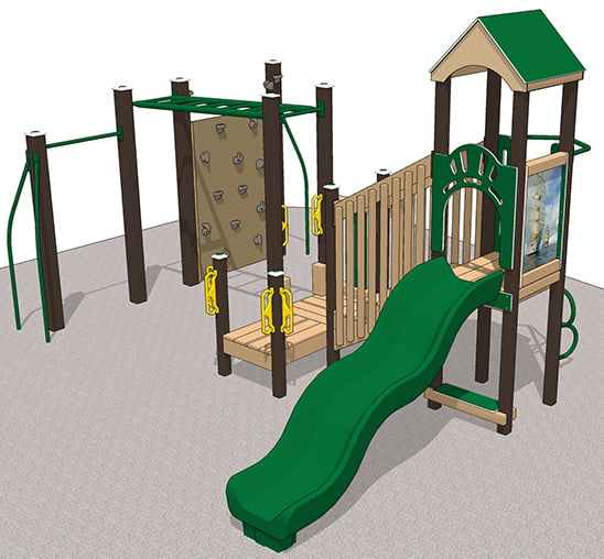 Features abound with an overhead Ladder, Rock Wall, Slide and more.