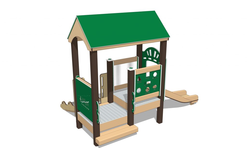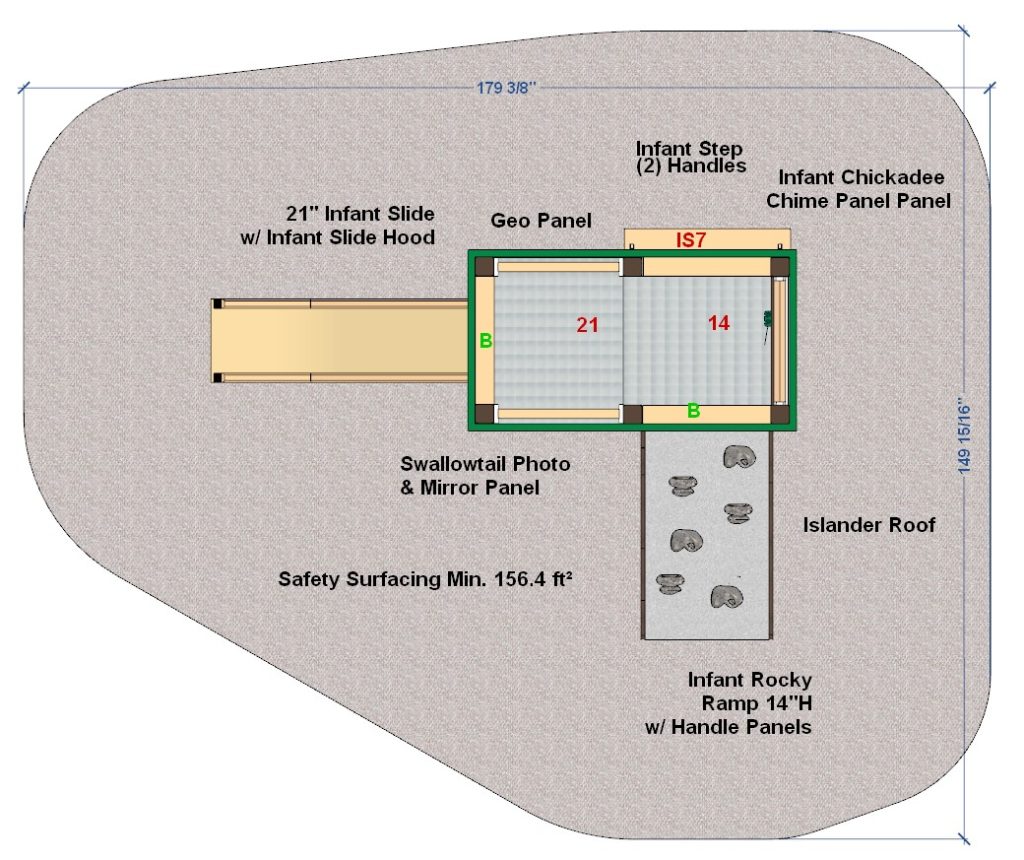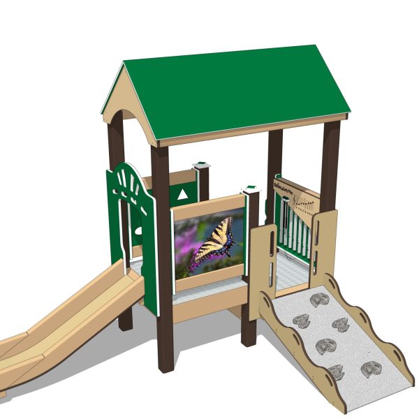 The Tiger Swallowtail infant and toddler playset is perfect for smaller children and smaller playgrounds. Babies will love the infant sized climbers, decks, slides and chime panel. Infants and toddlers will develop large and small muscles while climbing the Rocky Ramp and balance going down the infant slide.