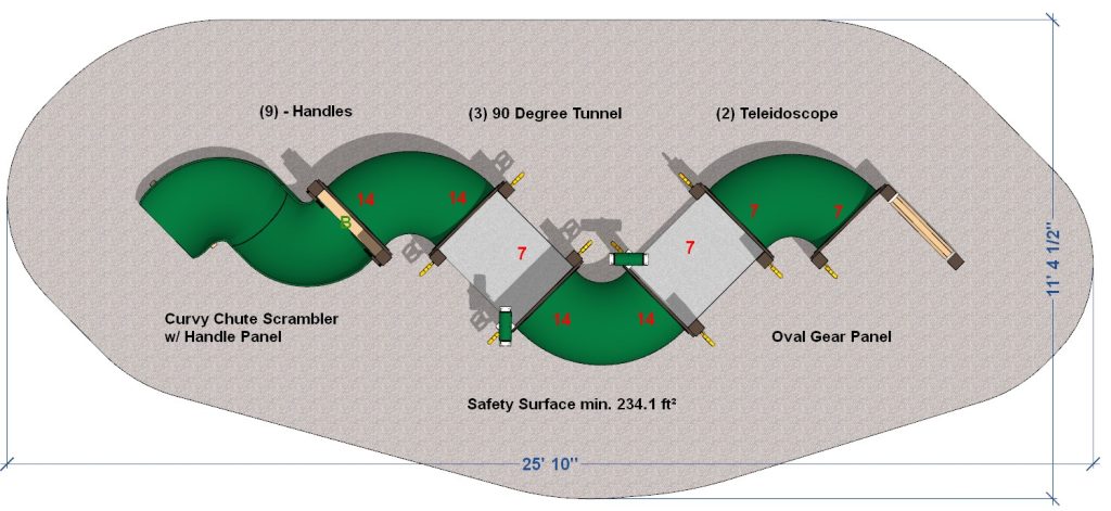 At one end of the set, an interactive gear panel stimulates their curiosity and develops their coordination. At the other end, a Curvy Chute Scrambler helps to build strength and balance. Along the way, two of our exclusive Teleidoscopes invite tots to scan the horizon.