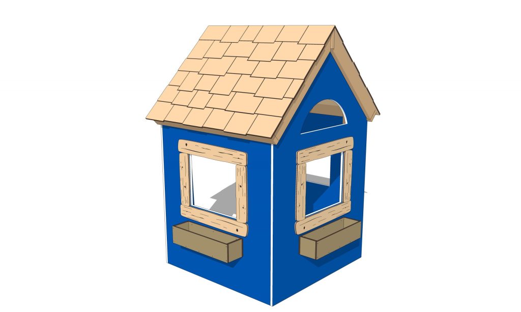 The Wee Tots Clubhouse includes two benches along the inside walls, a doorway, three windows with planter boxes, and a requisite Kids Only sign above the door.