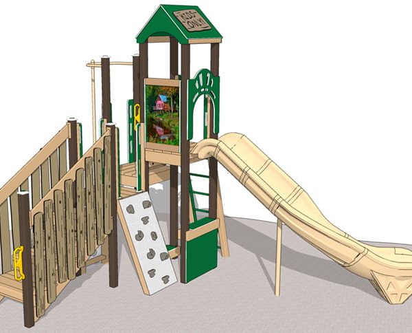 Multiple climbers provide entry at different heights, just like branches in a tree. Engraved planks on the handrails and panels mimic real wood without the splinters. The roof boasts a similarly engraved “Kids Only” sign.