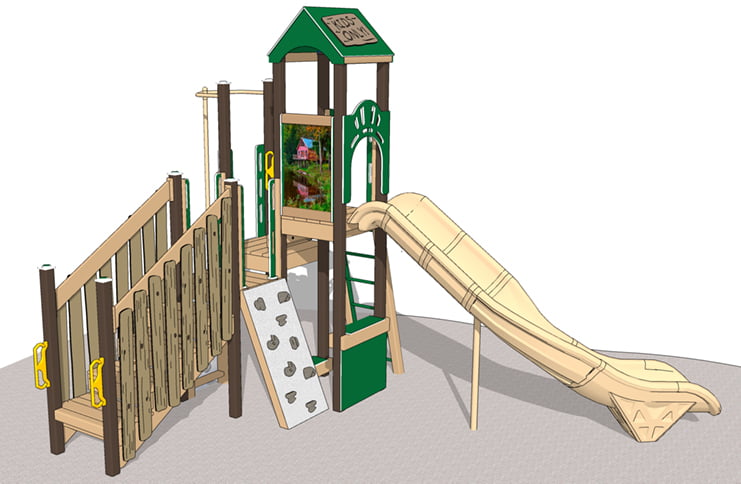 Like other Play Mart Playsets, the Wonky Treehouse is made from Recycled Structural Plastic™. Which is not only safe, long-lasting, and strong, it uses recycled milk jugs and prevents them from ending up in landfills and oceans.