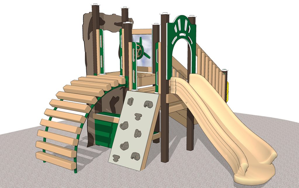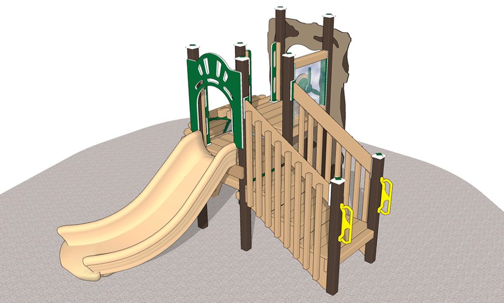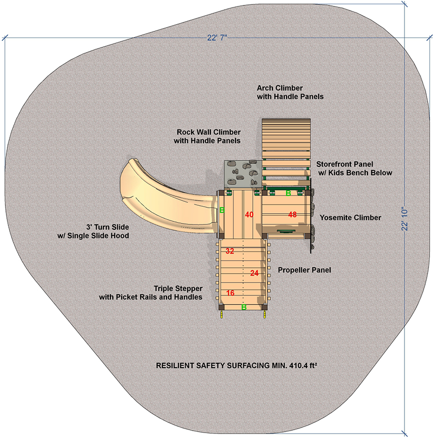 Safety Zone: 25’-6” x 19’-6” Age Range: 2-5 years Post Size: 3.5 inch Child Capacity: 12-14 Fall Height: 36” 4’ Border Estimate: 19 Meets ADA Guidelines Elevated: 3 Ground Level: 1